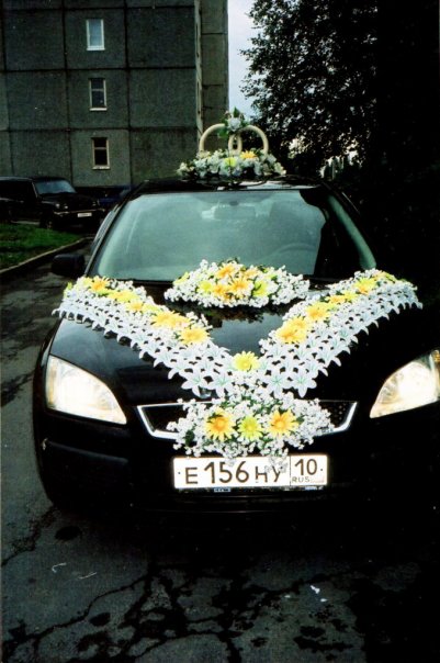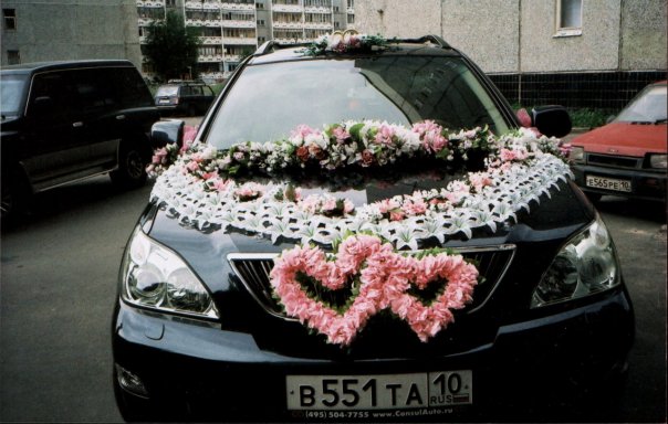 честно? никак))) чот ужас ужасный)) не хватает еще росписи синим маркером под хохлому  бывают невесты с клумбами на головах, а тут машины - целый ботанический сад))) ну, по фоткам видно, что давно дело было. и судя по региону - где-то в Карелии. мот там так модно было в лихие 90-е...
