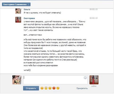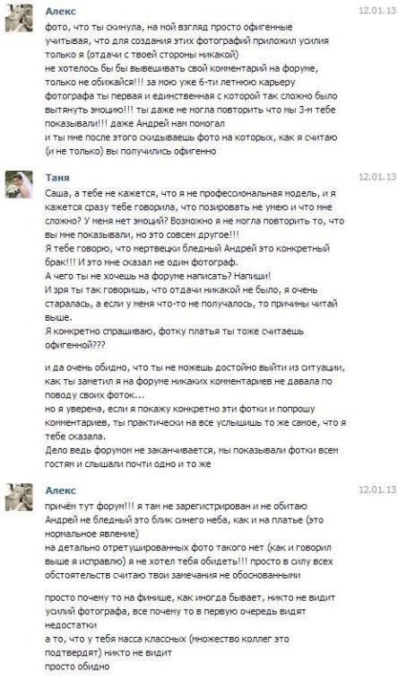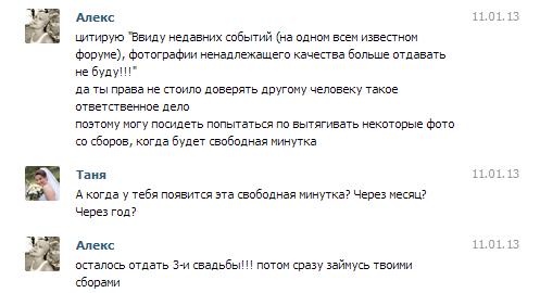 Первые пять претензий я написала фотографу, ниже прилагаю нашу переписку, чтобы не быть голословной. С остальными уже ничего не поделаешь, к сожалению. 3. По поводу напарника:На нашу свадьбу Alex Зеленко попросил взять напарника, со словами «вам это ничего не будет стоить, человек потренируется, а вам будет в 1,5 раза больше фоток». В итоге, мы об этом очень сильно пожалели. Напарника он взял, но вот фото от напарника мы так и не увидели. Мы пытались добиться этих фоток с конца ноября 2012, когда забирали наши, до января 2013. Фото Алекс Зеленко так и не отдал (подробности смотрите в переписке в конце отзыва). 4. По самому свадебному дню и содержанию фото:В сам свадебный день мне казалось, что все идеально… Просто мне хотелось так думать. Кое-что в поведении нашего фотографа Alex Зеленко, нам не понравилось 1) Нет ни одной фото как мы выходим из подъезда, рассаживаемся по машинам 2) Пока мы ходили по парку, он все время шел далеко впереди со своим напарником... 3) Когда мы в парке вернулись к гостям и сестра мужа попросила нас сфоткать, фотограф сказал, что будет фоткать нас в столовой и мы очень опаздываем, хотя мы были не против сфоткаться с гостями на природе. Так что фоток с девчонками у меня, как и фоток мужа с парнями у нас нету . Вообще к концу свадебного дня у меня просто сложилось впечатление, что он хотел просто как можно быстрее от нас свалить. 4) Нет фоток как мы приехали в столовую. Зеленко ехал на другой машине и приехал раньше нас. Но сразу убежал наверх (при том, что за день до свадьбы, я сказала, что хочу сфоткаться на К.Маркса (у нас там была столовая)). Моему дяде почему-то ни дождь, ни холод не помешали дождаться нас и сфоткать как мы приехали. 5) У меня нет ни одной фото меня со сборов невесты. Алекс Зеленко сказал, что меня фоткал напарник, фотки напарника «типо» вышли плохого качества и все… Фото аксессуаров тоже нет, хотя все лежало вместе и подвязки и кольца и свечи… Специально все было выложено на полочку около зеркала. А я обращала внимание именно на сборы! Что я хочу чтобы обязательно сфоткали как меня красят, мои аксессуары !!! Но фотограф просто проигнорировал мои просьбы.5. Из послесвадебного общения:Фотограф наотрез отказывается признавать свои ошибки, а еще и пускается в оскорбления (см. ниже в переписке). Я выкладываю сюда фото нашей переписки, просто чтобы вы могли объективно оценить ситуацию (на первом читать снизу вверх ). Вложение: