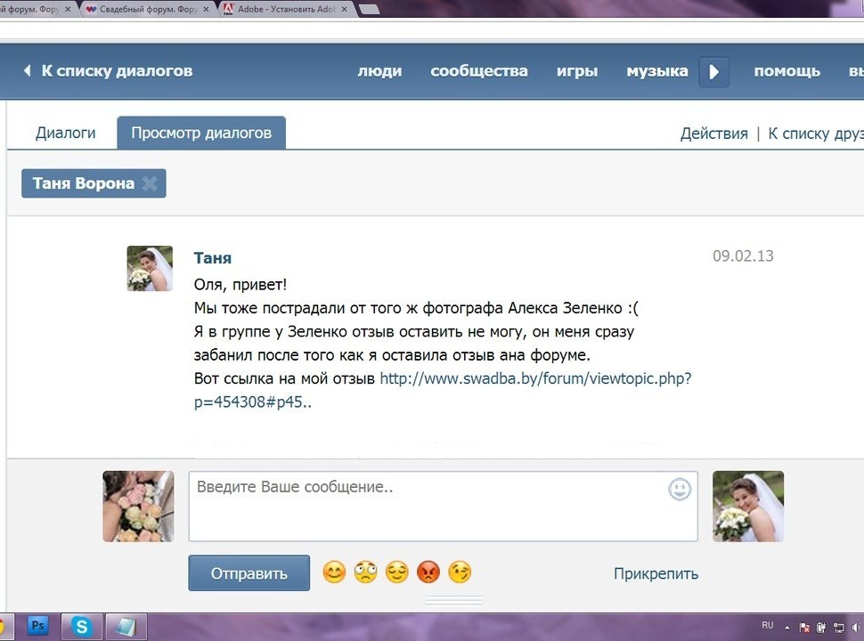 Я, возможно, в подобной ситуации тоже защищала бы мужа, только отзывом проблему ведь не решишь. Множество моментов со свадьбы упущено,а вместо того, чтобы исправить ситуацию, ты еще и получаешь "благодарности" за пиар и "пожелания благополучия".Это очень низко с ее стороны. А вот с ним общалась моя свидетельница, которая тоже очень -очень ждала фото и была безумно ими разочарована! Но на самой свадьбе неплохо с ним общалась, поэтому писала очень деликатно. И что? Отзыв мой-это бред, он от него смеялся( а мне хотелось плакать от этих фото!!!) и вообще он молодец. Выставил в защиту слайд-шоу. Но слайд-шоу не вклеишь в свадебный альбом!! Многие фото, которые неплохо смотрятся в нем, сами по себе несостоятельны. Вложение:
