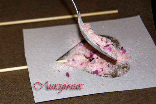 Количество карамелек и розовых лепестков зависит от желаемого количества и размера сердечек. Из 150 г карамели и горсточки лепестков получается около 20 сердечек размером ок. 5 см.
