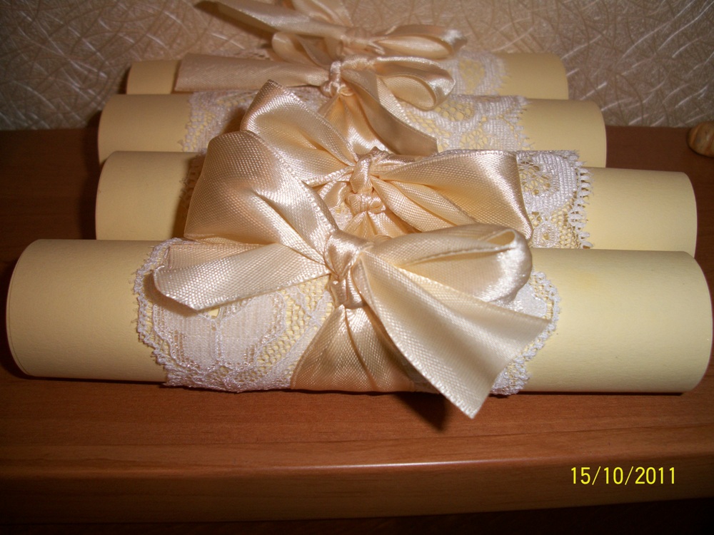 9.ПригласительныеТут я хочу сказать огромное СПАСИБО www-to4ka, за текст пригласительных, все было стырено у нее  , но предварительно я согласовала это с ней, Еще раз Вам спасибище У меня было 2 вида пригласительных:скруток, которые лично в руки и которые пересылались по почте.