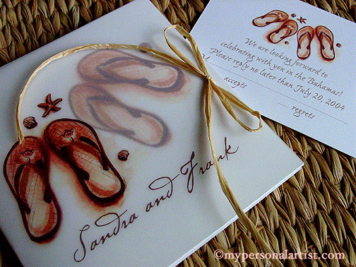 Можно взять за основу понравившее сприглашение и добавить туда рисунок девушки в купальнике или вот есть с въетнамками