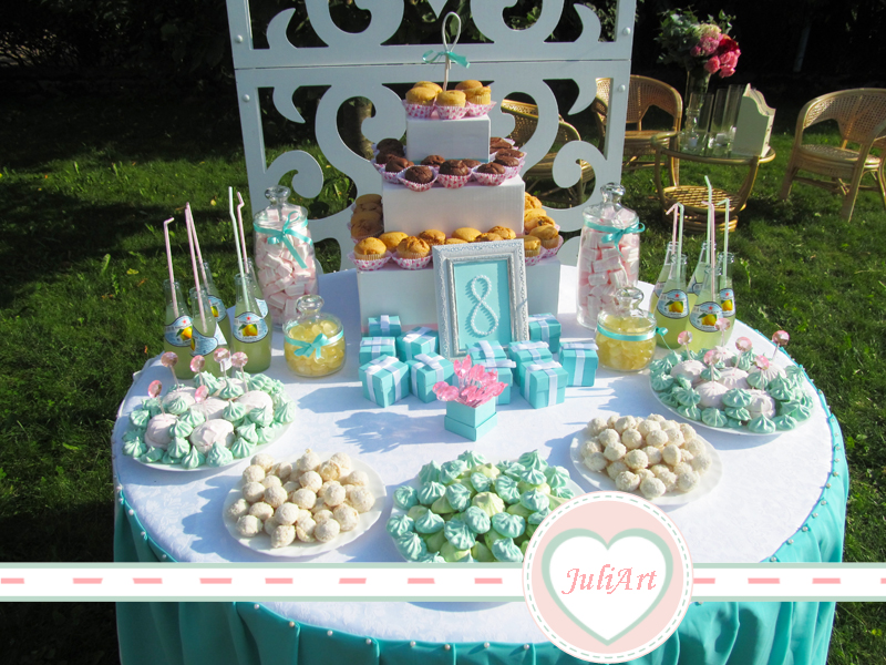 Еще была у нас лаундж зона ненавязчивая и кенди бар. Который по итогу пришлось поставить не в шатре а на улице, так как не хватило места. Тут немного не все вышло как планировали, хотели сделать из мятных меренгов сделать пирамидки(которые делала мама а я смешивала краску пищевую в цвет нашего зала). Но был такой ветер что даже одну вазу с подаренными цветами развернул и разбил. И мы отказались от затеи выложив их просто на тарелочки. И бутылочки не успели убрать этикетки, так как я нашла сок в стекле на утро перед торжеством. Очень много объездила магазинов. Ну конечно пришлось офомлять кенди бар прямо перед приходом гостей, чтобы на улице на солнце это все не потекло. Было жарко. А столик с регистрации потом перебазировался к кенди бару. Там находилась книга пожеланий. Еще была подсветка вдоль всей дорожки из свечек в баночках из под детского питания (невестам на заметку) выкрашенных в белый цвет. Но фото у меня нет к сожалению.