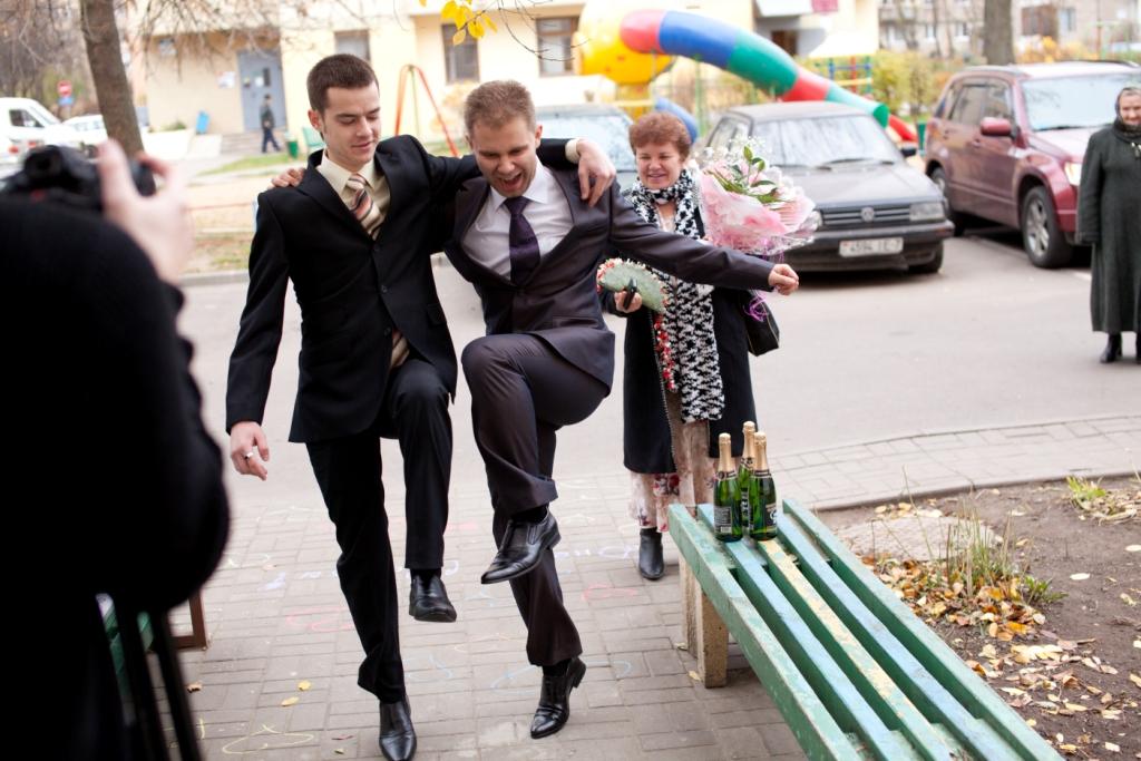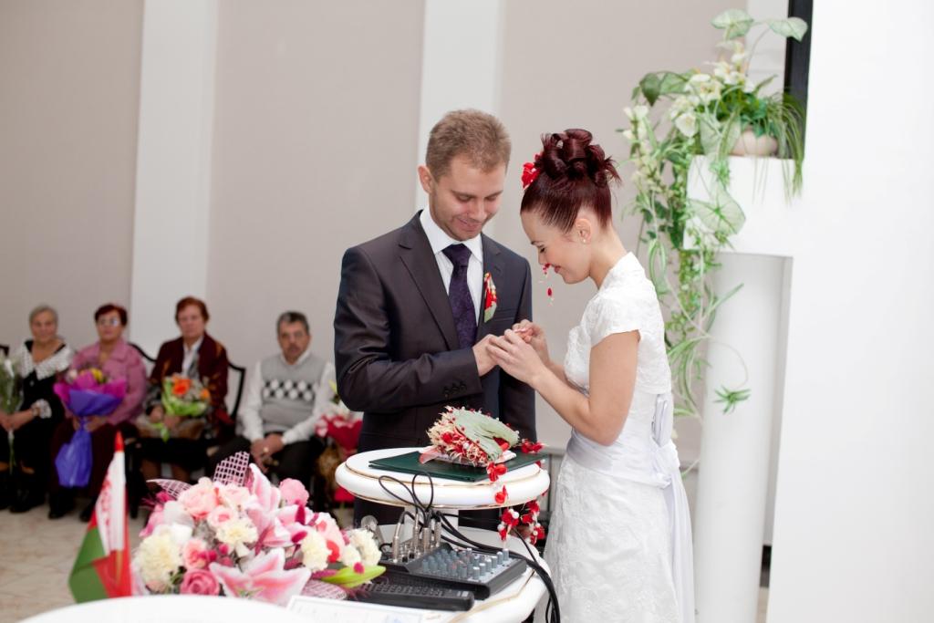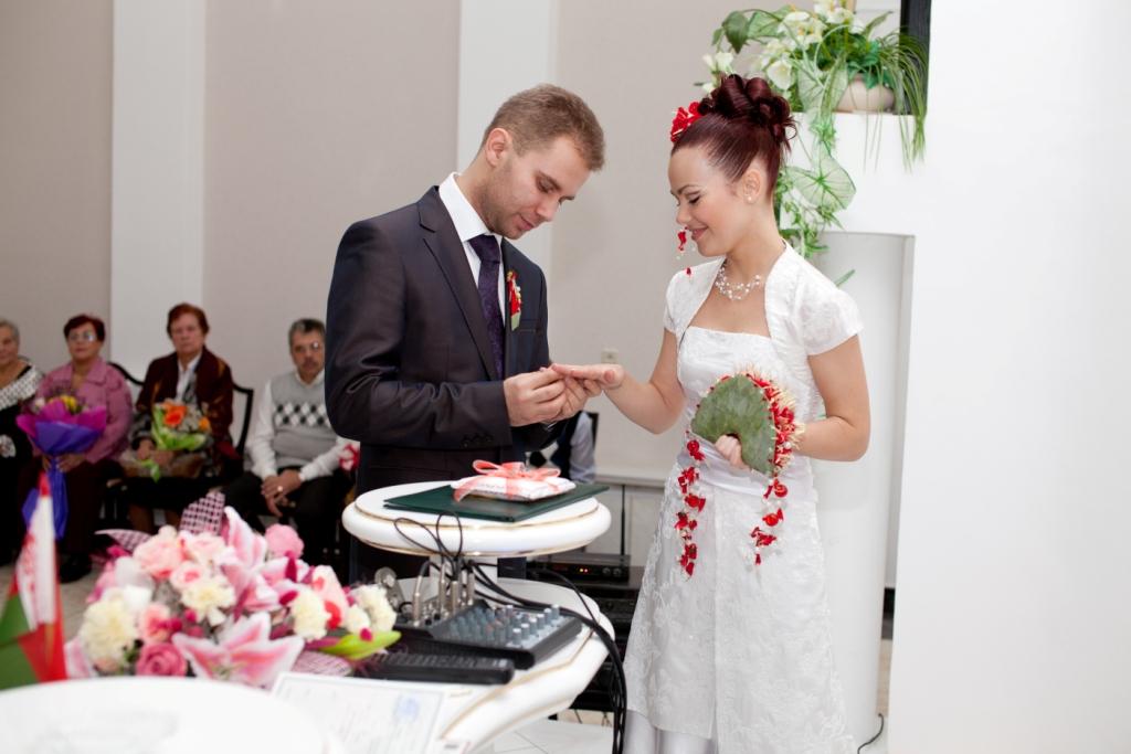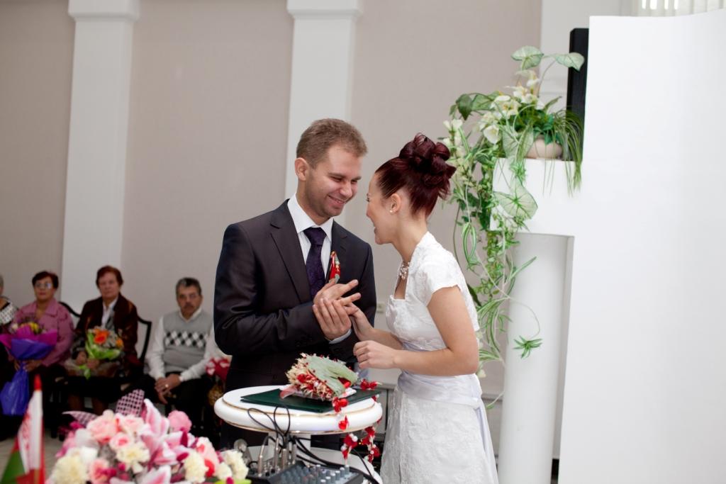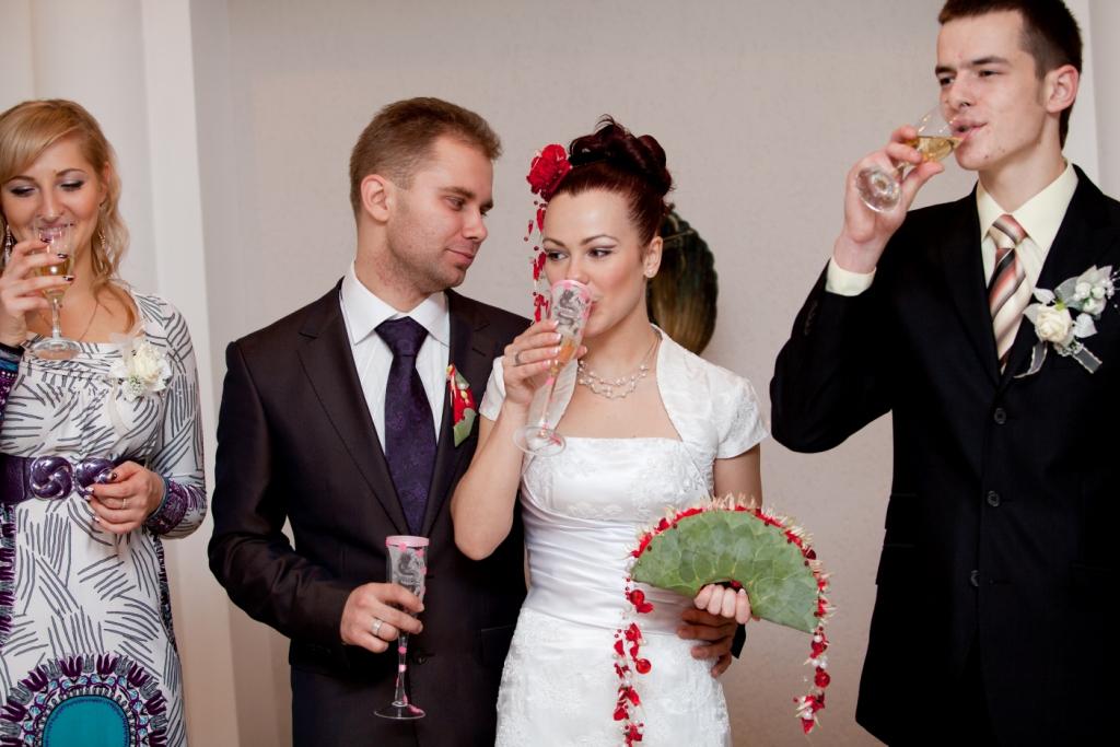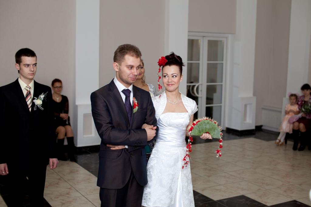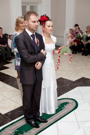 Часть вторая - официальнаяВ ЗАГС было очень весело идти - со всех углов выползали наши гости, в окнах торчал народ ) К скольки мы туда дошли - не имею ни малейшего представления ) Единственное, что помню, это чьи-то слова о том, что до росписи 10 минут, а мы ещё дома  Значицца дошли мы до ЗАГСа, а вокруг - никого, ни одной пары в свадебных платюшках. Я таааааак обрадовалась сему факту, что вам не передать. Когда мы зашли в оное помещение, то там я увидела ещё одних желающих расписаться. Кто-то из их гостей спросил:" Вы на 12-00?". "Неа, - отвечаю я и нагло улыбаясь иду вперёд ))) Встречает нас тётенька, уточняет время росписи и говорит сдавать верхнюю одежду в гардероб. Значицца сдали, я оборачиваюсь - а вторую пару уже ветром сдуло ))) Нас с любимым отправили в комнаты жениха и невесты. Наш оператор Митя спросил у меня, что я чувствую. Какие, к чёрту вопросы???? У меня нервы уже на пределе!!!! Что-то ему буркнула и продолжила увлекательное занятие по нарезанию кругов по комнате. Наконец-то нас позвали к залу регистрации. Тётенька говорила там что-то, куда стать, куда нет, кому слова благодарности говорить, куда спиной не поворачиваться. А у меня не то, что в одно ухо влетело - в другое вылетело, у меня даже до первого ничерта не долетало.... И тут нам включают мендельсона и мы заходим в зал. Регистратор начинает говорить свою речь (я даже почти прослезилась в какой-то момент, но в какой?). Пошли мы потом свои афтографы ставить, потом свидетели. Потом снова мы пошли кольца одевать друг другу. Мне легко колечко оделось,а вот любимому..... Пыталась насунуть - никак не лезет ))) В конечном итоге он отвернулся от гостей спиной и втихаря сам себе его одел  За время регистрации мы успели рассмотреть где сидели какие гости и обсудить, что наши мамы сели отдельно вдвоем и что-то там обсуждали и покорчить рожицы нашему фотографу ) Но все это время я ощущала тепло рук своего любимого человека, стоящего рядом. Ещё в самом начале церемонии он положил свою ладонь мне на руку и нежно поглаживал её.... Эти простые движения успокаивали и наполняли меня осознанием того, что я теперь навсегда принадлежу ему, а он мне. Что с этого момента больше нет нас по отдельности,а появилось новое понятие МЫ. Что с этого момента мы все горести и радости будем делить вместе, и это возносило меня на вершину неба.... Дальше были поздравления от гостей и пару фоток. Потом всех пригласили в зал шампанского,а мы подошли поблагодарить регистратора, которая нас ещё раз поздравила. В зале шампанского насмеялись,как неизвестно кто ))) ведущий спросил у свидетельницы, какое шампанское она пьет. "Счас ещё раз попробую" - был её ответ. "Полусладкое!" - выдала она после очередной пробы. На что дяденька ведущий заявил, что оно нифига не полусладкое, а горькое  И понеслось.... Все начали считать,но они забыли, на кого нарвались. Мы ведь можем целоваться ой как дооооолго ))))) Ну в конце концов решили оторваться друг от друга, ведь впереди ещё кафе  Ведущий сказал, сколько мы целовались - столько у нас будет детей. Итог - многодетные семьи отдыхают - аж целых 15 штукаф!!! Где б денег взять на их содержание, а?  Главенство в семье я отдала мужу и мы пошли забирать одежду из гардероба и собираться на выход. Свидетельница раздала всем лепестки, а мы стоим как дурики за дверями и не знаем, когда нам выходить. Стоим, шутим, дурачимся и корчим рожи ))) Пот