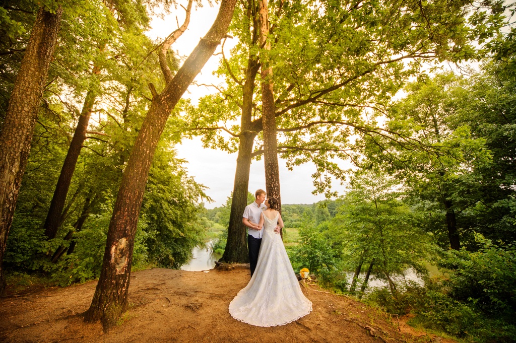 Было уже около четырех часов дня, когда мы подъехали к Дроздам. Снова пошел дождик. На этот раз мелкий и противный. На улице было достаточно прохладно и серо, трава и деревья стояли полностью мокрые. О том, чтобы выставлять декор на вторую фотозону речи быть не могло... Я расстроилась и перенервничала, да и наше время подходило к концу. В шесть нас ждали в кафе. Это значило, что на то, чтобы пофотографироваться у нас оставалось от силы минут 40... Реквизит остался лежать в машине, а мы, взяв букет и зонтики, пошли гулять под дождем... В первую очередь мы направились в то место, где состоялся наш первый поцелуй: в самом начале парка, на обрыве над рекой, между стоящими рядом сосной и дубом, что сплелись кронами, будто обнимаясь... Вложение: