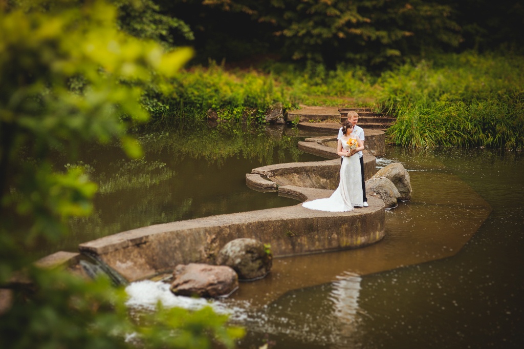 В парке в нескольких местах веселые и мокрые компании жарили шашлыки. Со стороны мы представляли, наверное, забавное зрелище. Невеста, на каблуках и в платье со шлейфом, идет по мокрой траве, прическа слегка уже растрепалась, жених несет букет и ловит невесту, ибо с равновесием у меня беда... Под деревьями противный дождик практически уже не чувствовался. Мы шли по дорожкам по направлению к сказочным водопадам, местами фотографируясь. Мои ноги начали потихоньку уставать. Несмотря на то, что туфли я разнашивала пару недель и чувствовала себя в них очень комфортно, высокий каблук и усталость сделали свое дело... Дождик прекратился, погода стала улучшаться, даже немного посветлело. А вот время подошло к концу, в кафе мы уже безбожно опаздывали. Телефоны наши остались в машине, так что звонки от волнующихся родственников прошли мимо нас. Саша и Лера, спасибо им, тормошили нас и помогали, ибо сами мы уже слабо соображали, что делать, куда идти и как становиться... Вложение: