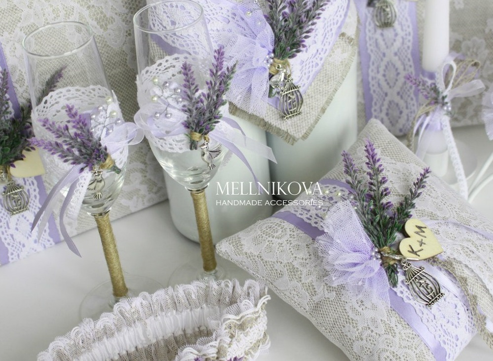 Описание: Свадебные бокалы из коллекции свадебных аксессуаров "Прованс" Идеальный вариант для "Лавандовой" свадьбы! Бокалы украшены хлопковым кружевом, веточками искусственной лаванды и жемчуга. Металлические подвески-птички, как символ семейного счастья!