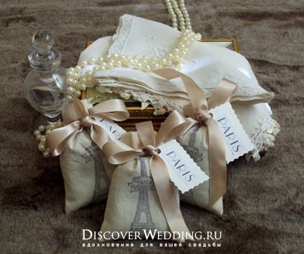 Привет! Идея с Парижем очень даже не обычная, думаю такой тематики свадеб было очень мало! Очень понравились бонбоньерки, особенно мешочки, так оригинально с эйфелевой башенкой!
