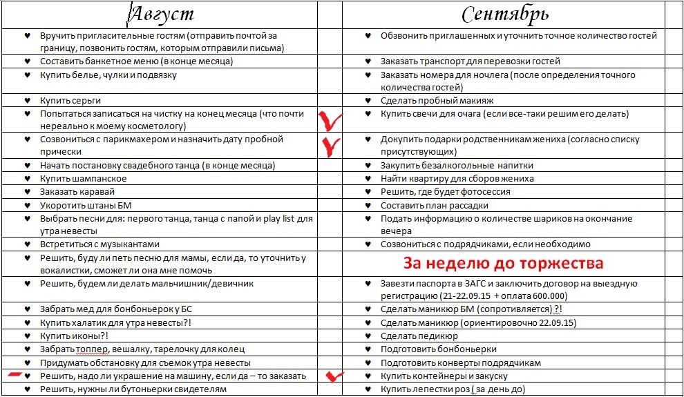 Katrin_Zh, Fiora честно говоря, девочки,я не особо запариваюсь и часто хожу. Не была пару лет. Ходила в конце апреля и вот планирую в начале сентября. Проблемок не так много на лице, или все таки я такая ленивая по отношению в плане ухода. Мама вчера заказала каравай и пряники для кенди-бара. Закрыла пунктик по-поводу украшения машины. Т.к. Машина у нас одна. Кортежа не будет. Поэтому с БМ решили,что просто незачем ее портить. Таким образом к 4.08 некоторые пунктики готовы. И практически половина приглашений роздана.