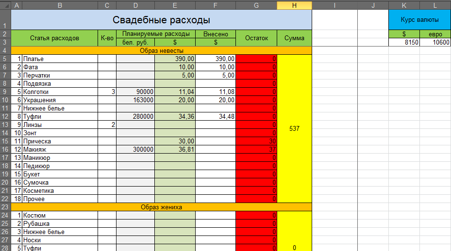 Кстати, могу поделиться своим калькулятором! Основные разделы: образ невесты, образ жениха, общие расходы, 1 день и второй день.