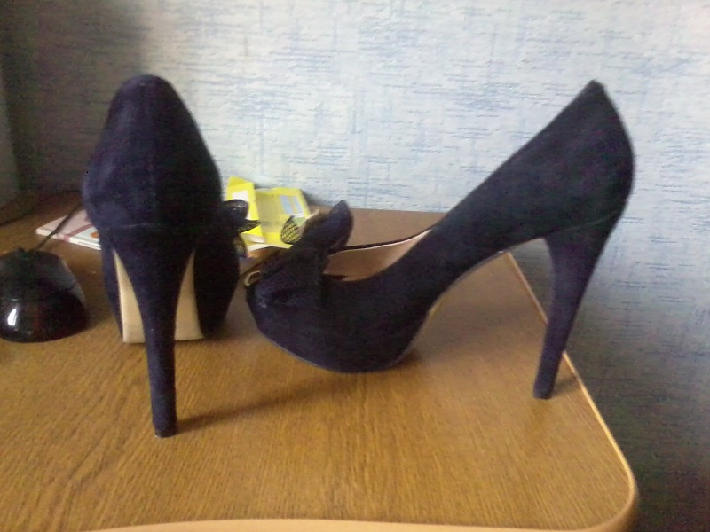 Купила в первом же магазине! Пришла в зеркало, поднимаюсь на второй этаж, второй магазинчик с обувью. Уже поворачиваюсь, чтобы уходить и вижу ИХ! Последний размер и мой! Замшевые, черничные!!!! Правда на них есть ещё бантик и маленькая розочка золотистого цвета, но я её сниму. Может быть с бантиком что-то придумаю, решу по ходу дела.