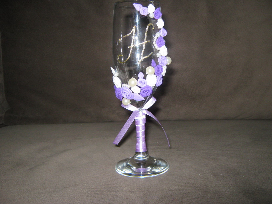 nastena13, попробуй убрать один ряд цветочков у основания. Их там слишком много. Если будет идти тонкая полоска из цветочков снизу вверх - получится нежнее. И (может быть ) не так плотно обкручивай ленточкой ножку. Может быть попробовать сделать ее полосатенькой ( с промежутками). А так плотная обмотка зрительно укорачивает ножку. А в целом - основная идея премиленькая. Просто чуток поэксперементируй с одним из бокальчиков. А потом сравнивай его со вторым!
