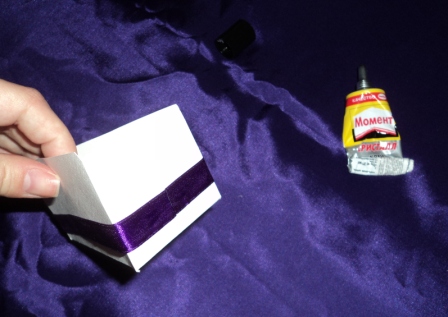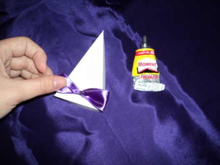 Используйте клей "Момент кристалл". Другие виды клея ленту не держат или оставляют на ней следы.Приклеиваем ленту. Линия её сгиба должна лечь на самый острый угол бонбона.