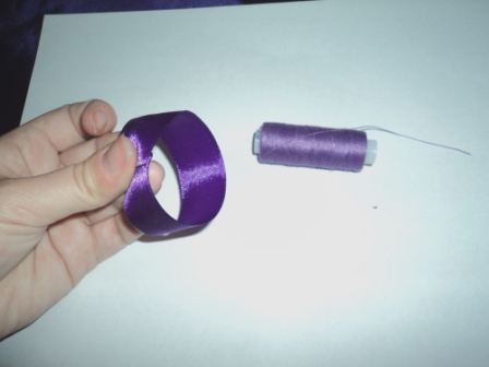 Обязательно предварительно опалить концы ленты, иначе она разойдётся! Берём нитки того же цвета, что и лента.