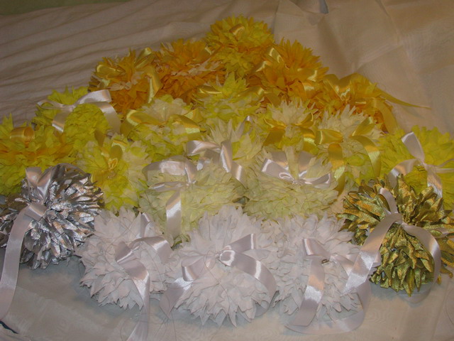 Девочки! У меня уже помпушек двадцать!!! Как то я уже устала...))) В хорошем смысле слова))) себе сделала одну розовую! Потом покажу фото))))) У меня помпуши похожи на хризантемы))) Классно получились золотая и серебрянная))) Даже отдавать не хочется. Себе сделаю обязательно!!!
