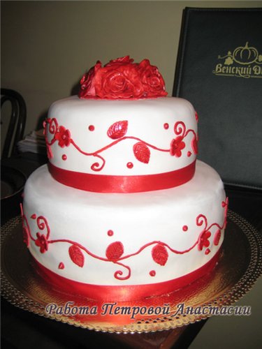 Бело-красный - это я такой хочу, наша оформительница очень просила (и это понятно) тортик в тон тематике зала - мол, ладно с розочками, но пусть они будут КРАСНЫМИ