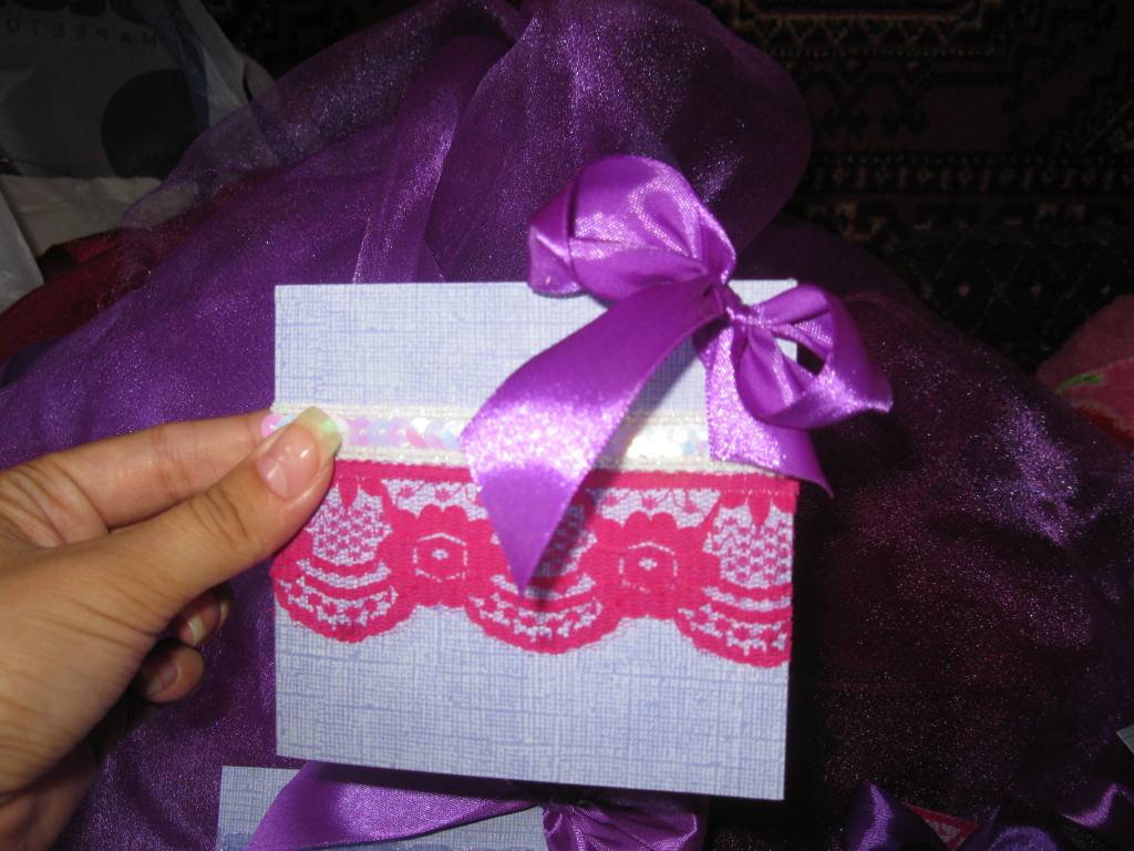 А пригласительные на самом деле почти все разные, хотя такой задумки изначально не было  Само собой так вышло, что я вошла во вкус и начала выдумывать.  Вчера ещё закупила разных тесёмочек и кружева, а мама моя всё удивляется, сколько это мне доставляет удовольствия  Мол, как мало надо для счастья, всего лишь 3 метра красивой ленты Хочу сделать сама красивый большой бант на машину, купила фатина (он есть на фото пара страниц назад), только он очень мягкий, придётся крахмалить или желатинить его, чтобы торчком был.
