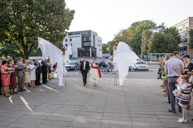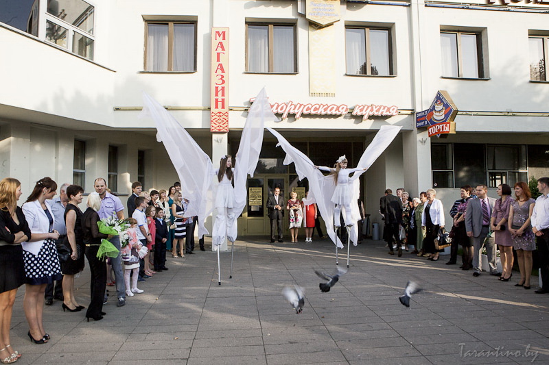 после фотосессии мы поехали в ресторан, где на входе нас ждали родители и ангелочки на ходулях