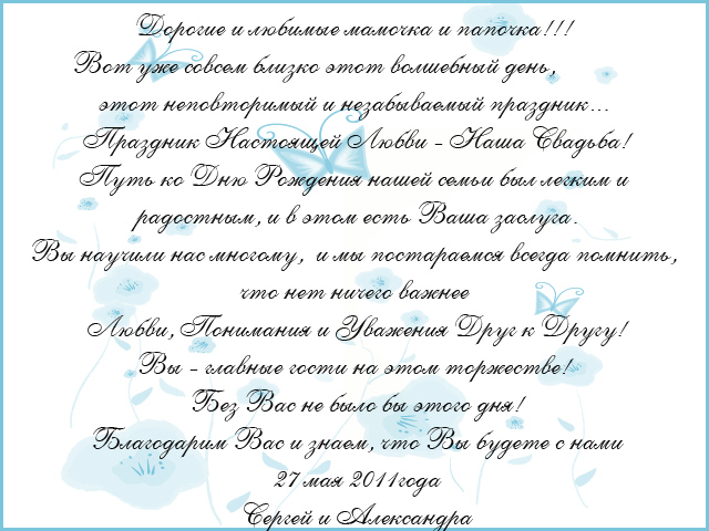 Вот думали этот текст сократить для родительских приглашений. Но тут тоже есть "но": у моего жениха есть младший брат, если его родителям делать такое приглашение, то для брата надо будет отдельное... Вложение: