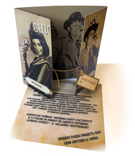 Valery С платем пока не определилась, сегодня поеду примеряться... По тематике я планирую: приглосы, бонбаньерки, встечу гостей организовать в сите Чикаго. Вот одна из статей, как я хочу: Свадьба в стиле Чикаго Свадьба в стиле Чикаго представляет гангстерскую, воровскую эпоху прошлого века. Это времена казино, сухого закона, повсюду играющего джаза, бандитские, тайные сообщества, нелегального оружия, наркотиков, кабаре и т.д. 1. Если вы хотите сыграть свадьбу бандитской эпохи, то вы должны выдержать нрав того времени, начиная со свадебного приглашения, которое можно отправить всем гостям в тубусе от сигары, либо в виде контрамарок, вырезок из газеты. 2. Текст приглашения также должен быть написан от лица гангстера, который приглашает своих друзей, коллег на тайное собрание по поводу его свадьбы. Можно ввести Dress cod, какой-нибудь пароль для входа. 3. Для жениха можно подготовить маленький черный чемоданчик, в котором будут лежать деньги, предназначенные для выкупа, конечно, не настоящие. 4. Ресторан или место проведения свадьбы должны быть украшены фрагментами из той эпохи. Это могут быть специально заготовленные афиши, объявления на английском языке, которые можно сделать самостоятельно, также расклейте фотографии гостей и свои, подпишите, что разыскиваются, укажите размер вознаграждение, фотографии Нью-Йорка, знаменитостей, какие-нибудь плакаты того времени. Возможно, вы захотите провести свадьбу в каком-нибудь ресторанчике, которое будет находиться в подвале – тайное место сбора гангстеров. Столы должны стоять отдельно друг от друга по 5 – 7 человек. На стол можно выбрать зеленые скатерти, как в казино. Хорошо, если вы арендуете ресторан, оформленный в стиле кабаре. 5. В качестве свадебного танца можно выбрать фокстрот, танго (но тут мой БМ настаивает только на класике) 6. Невеста и жених должны подобрать себе наряды, которые будут похожи на гангстерские. Невеста к свадебному платью может подобрать перчатки с открытыми пальцами из кружева. Туфли лучше выбирать на не большом каблуке-рюмочка. Прическу и макияж того времени будет сделать нетрудно, просмотрите журналы или просто попросите стилиста-визажиста. Отличительные черты - это ярко накрашенные глаза и губы «бантиком» . Поверх платья, на плечи накиньте белый мех. 7. Подружек невесты можно нарядить в цветочниц, у которых будут корзины с цветами, в конце вечера эти цветы можно раздать всем гостям. А в подвязках они будут носить виски и предлагать гостям на прогулке. 8. Жениху подойдет белый костюм, черная рубашка, белый галстук, белые туфли с острым носком на шнурках, белая шляпа с черной лентой. Можно взять с собой бутылочку виски, или фляжку с фиски. 9. Все желающие могут одеться в костюмы той эпохи, а всем остальным на входе выдайте соответствующие атрибуты. Для мужчин – шляпы, подтяжки, трости, бабочки, и т.д. Только у гангстеров рубашка может быть темнее, чем галстук. Всех, кто курит попросите в этот вечер курить только сигары. Для дам – веер, перья, искусственные меха, мундштук, перчатки, чулки в сеточку. Макияж в стиле «смоки айс», никакого загара. В конце вечера можно устроить конкурс на лучший костюм, если гости заранее позаботятся о своем наряде. 10. На входе можно посадить мальчика «Томи», который согласиться сыграть роль чистильщика обуви, все гости, которые захотят почистить обувь, буду