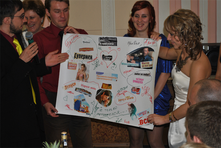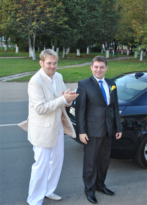 Такссс, продолжим)))) На фотосессию я планировала около 3-х часов до ЗАГАСа и 1,5 часа после))). Но т.к. мой любимый решил подольше поспать они слегка" опоздали и не отпустили оператора вовремя, первое время сократилось до 2-х, а им пришлось стоять около дома и ждать пока снимут клип невесты))). Фотосессия прошла на одном дыхании, мы прыгали, бегали, бесились, искали воду, пили шампанское, ну и конечно же  целовались  . В это время гости распили две бутылки шампанского и съели всю ссобойку, которую собрали и моя мама и свекровь))) Кстати, людей каталось с нами мало и в основном не пьющие, так что освновной удар приняли на себя свидетели и мой Арифчик  (в кафе пришлось их не много придержать подальше от спиртного). На фото и видео съемку мы ездили в Усадьба "Панский Маентак Сула" место просто обалденное, но с наших выходных там ввели плату за фотосессию (что ввело нас в небольшой шок  ), хорошо что у брата с собой деньги были  . После СУЛЫ заехать в еще одно красивое место, но пробыли там не так долго как планировалось  , сделали пару кадров и поехали в ЗАГС. На выезде из одной деревеньки нам перегородили дорогу дети, я их угостила конфетками и мы полетели дальше. В ЗАГС мы естественно опоздали, поэтому регистрация полетела ускоренными темпами. Про ЗАГС что написать даж и не знаю, все прошло на одном дыхании, мы сказали ДА, обменялись кольцами, поздравили друг друга первым СЕМЕЙНЫМ поцелуем, получили первый документ и ручник. Потом был зал шампанского в котором нам (мне и Арифу) даже и выпить не дали (гости рвались поздравлять) пришлось большой бокал шампанского выпить залпом и на построение)))). На выходе из ЗАГСа нас ждали дети, которые каждые выходные караулят здесь конфетки. Раздав все конфеты мы по фотографировались с гостями и поехали в БИЛЬЯРД. В бильярде нам выделили столик и мы играли веселились и позировали  на столе))). Такого в Дзержинске наверное еще никто не видел, тк все внимание было только на нас. Следующее что мне захотелось осуществить во время прогулки - СЕСТЬ ЗА РУЛЬ СОБСТВЕННОЙ МАШИНКИ!!! И я это сделала  !!! Покатала мужа в люке, а потом он меня! Правда после покатушек у меня на платье была грязная полоска на спине  , но это меня не волновало, я наслаждалась каждой минутой этого дня. А еще нас городили))), при чем не стандартной табуреткой, а машиной  , это было очень не обычно. За такой необычный жест мы дали его машине немного "топлива" 4 бутылки водки  .