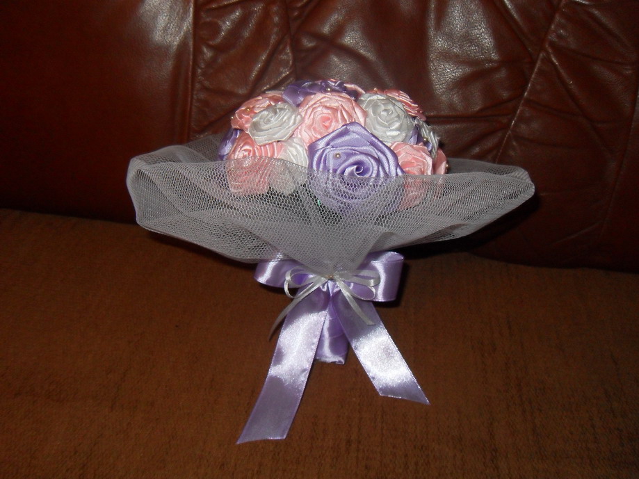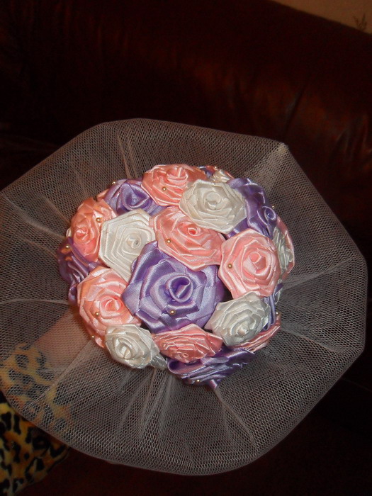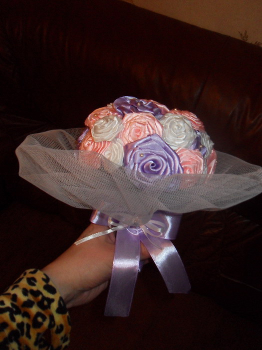 Юлия-я, эх, надо же поднапрягаться, как никак меньше месяца осталось...навдохновлялась твоим букетом и решила свой переделать))) Вчера весь день розочки крутила  Melnikova писал(а): молодец))) А какие ручки на машинах? да вот я пока не знаю. Если будут у нас бээмвэ, то скорее всего такие, которые вверх поднимаются - вот на них я и не знаю, как цеплять. Просто сначала наделала украшений, а потом подумала(