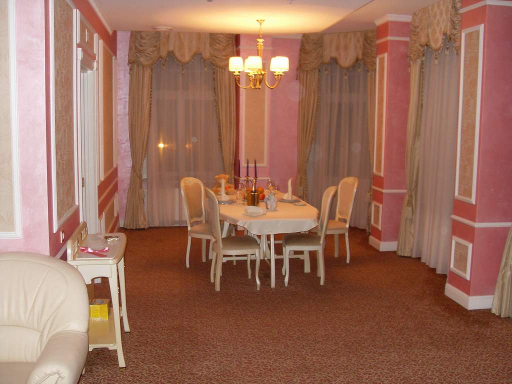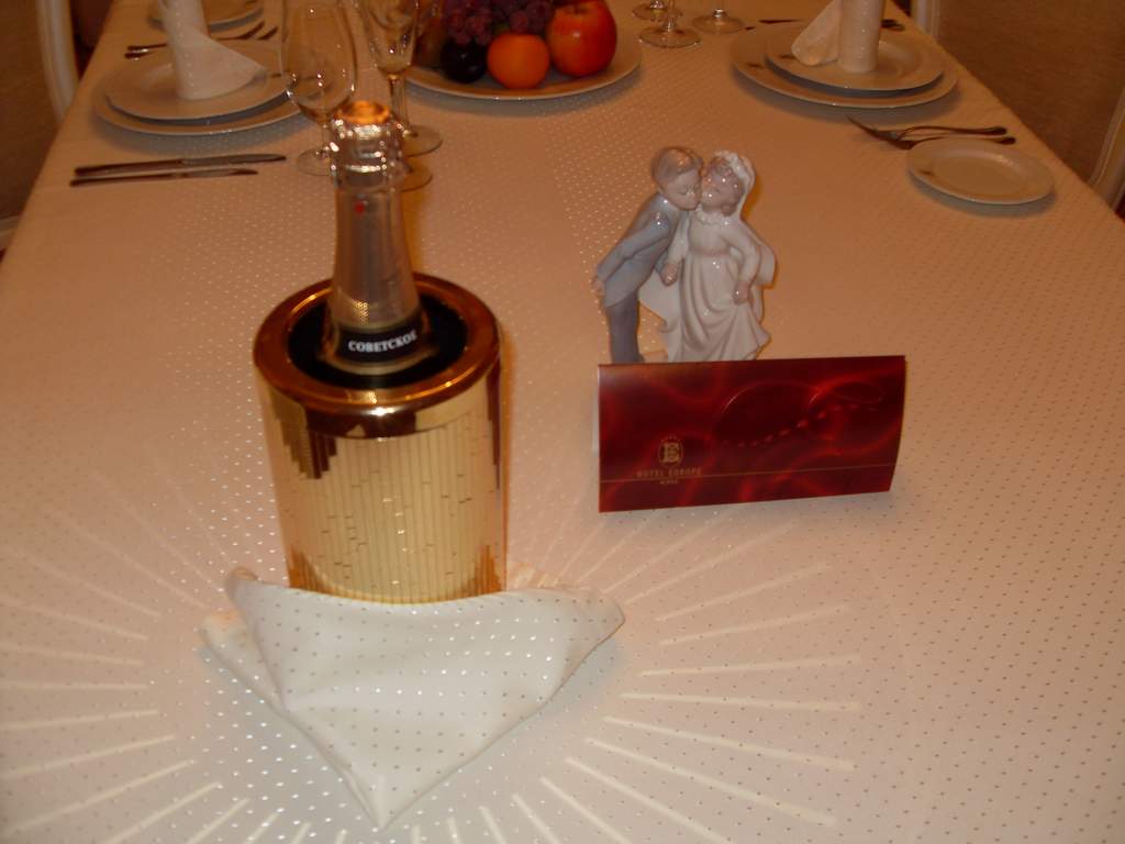 Четверг 10 ноября. Проснулись у любимого дорогого голова болит. Теперь я начала шутить. Собрались ехать в ресторан отвозить напитки и многое другое, так как голова болела Бондик забыл дома упаковку с Мартини обнаружили это только в ресторане в 17-30 11/11/11, когда выставляли питье на стол. Пришлось его забирать соответственно свадьба по времени задержалась.  и сместилась по времени. Потом уже ближе к вечеру поехали в отель Европа. Я до глубины души была удивлена когда нам дали розовый номер. Я так люблю розовенький. Спасибо им огромное было очень приятно, что не забыли.