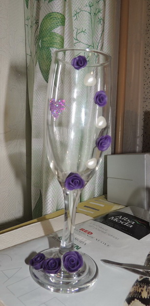 Девочки пробный бокал! нужны советы, розы будут светлее и мельче, сердце будет по контуру в мелкие полубусины, попробую сделать салатовые лепестки  бокалы будут другие...на длиной ножке принимаю любую критику и советы