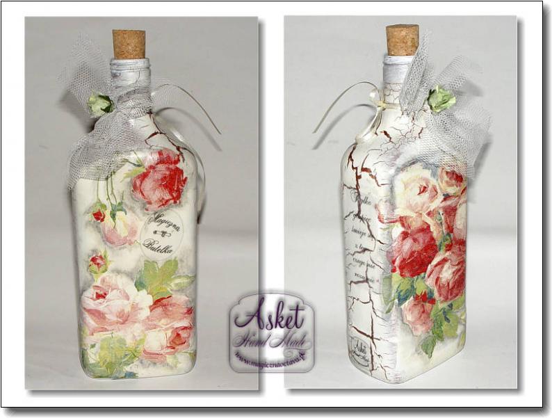 И так о бутылках. Очень хочется не просто ставить наши бутылки на стол, а немного их задекорировать. Многр разных мыслей. Надеюсь на вашу помощь. 1. Декупаж, наверное сделаю шампанское много бутылок (придется их потом забрать, а может кто-то из гостей захочет) Очень люблю эту технику, да и время не много относительно занимает. Единственное конденсат не испортит ли его? Напитки ж будут охлаждаться. Но наверное побольше слоев лака и все будет отличною Чтобы вы понимали о чем я, прилагаются картинки как это примерно будет выглядеть. Но это не окончательный вариант, да и наверное бутылки будут разные. Обязательно будет присутствовать кружево, ленты и наверное немного жемчужин.
