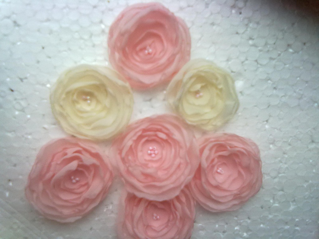 спасибо, девочки. Цветочки из подкладочной ткани, брала на пробу, из шифона они будут еще нежнее, делаются они ОЧЕНЬ легко, 10 минут на один цветочек:) буду докупать ткань получше. Еще можно совмещать шифон, например, с органзой или кружевом. Буду пробовать:)