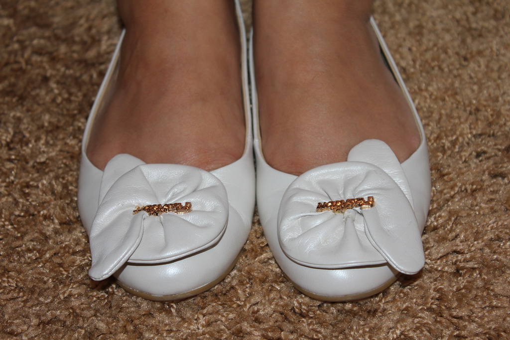 Хорошенькие туфельки. У меня 2 года назад подруга тоже обувала балетки, так как в жизни каблук вообще не носит, мне даже понравилось как фотограф обыграл туфельки на фотках.
