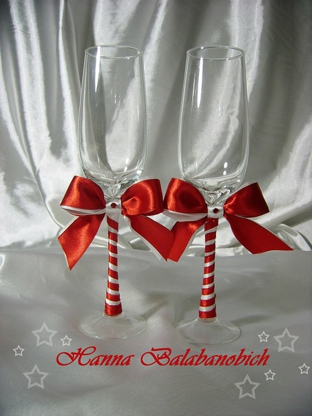 Ну, так как идея с бокалами? У меня свидетельница умирала со смеху, когда я ей рассказала, как мы выбирали цвета Единственное, пока не знаю на что крепить ленточки, бусинки, возможно, кружева и прочее... Или силиконовый клей, или двойной скотч?