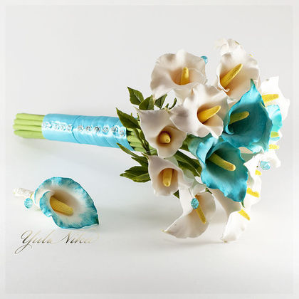 Бирюзовые (окрашенные) каллы - это жесть. Раскрашенные в ядовитые цвета свадебные цветы выглядят не очень. Цвет лучше добавлять лентами, фатином, перышками, бусинками и т.д. и т.п. А цветы - только живые и натуральные.(ИМХО)