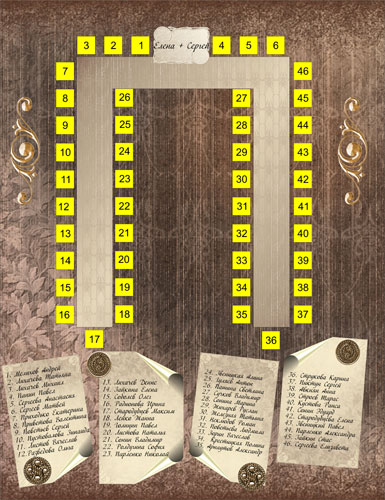 Гостей у вас человек 40 будет, значит по 20 человек с каждой стороны стола (вы я так понимаю будете сидеть на выступающей части). У меня плана и карточек рассадки не было, и на всех 8 свадьбах где я была тоже, но если тебе хочется, то тогда рисуешь прямоуголиник (вернее букву Г, как форму стола) и по обе стороны пишешь имена тех, кто где сидит, просто без плана только по карточкам мне кажется гости дольше будут свои места искать. И ксати тогда можно меловую доску для рассадки использовать, просто если бы была другая рассадка, то размера доски могло не хватить, а так план будет на одном листе. Кстати вот что-то на подобие того, просто можно сразу на плане вместо цифер писать имена