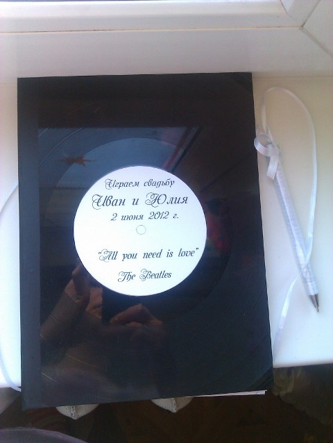 Далее по тематике: помимо фотозоны мы постарались сделать в музыкальном стиле всякие мелочи: карточки нумерации столов, план рассадки, сумки на мальчика-девочку (мальчика у нас символизировал Майкл Джексон, а девочку - Мерилин Монро), а также альбом для пожеланий. На нем бы я хотела заострить внимание. Дело в том, что обложкой для него стали настоящие виниловые пластинки, загнанные в переплет! Спасибо большое нашему декоратору Виктории и ее маме (они работают в паре) за то, что взялись за такую работу и сделали ее! Ну и главным украшением нашей музыкальной свадьбы (после фотозоны) стал белоснежный торт в три яруса, украшенный каскадом шоколадных нот. За него огромное СПАСИБИЩЕ Magic Bakery - частной кондитерской http://www.magic-catering.by Они вчера даже позвонили узнать, как нам торт, мол, они волновались, а я, балда, до сих пор отзыв не оставила. Фотографий пока нет, но девочки, он был ооооочень красивым и вкусным!!!!! Честно - самым вскусным в мире!!)))