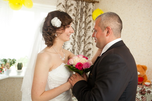 . Фотограф начинает меня фоткать, мне так нравиться его подход к работе, времени достаточно. Вот уже и БМ приехал, девочки убегают проводить выкуп, вскоре за ними идет и фотограф. Я остаюсь в комнате одна, заглядывает мама, прошу чуть-чуть побыть со мной, так как становиться волнительно, как перед открытием большой коробки с подарком, когда не знаешь что там внутри. Я стою лицом к дверям (я и забыла, что невеста должна встречать жениха отвернувшись) и жду устремив взгляд на дверь. Я вижу как она медлено открывается и вот ОН, такой красивый в своем костюме и розовом галстуке и протягивает мне букет