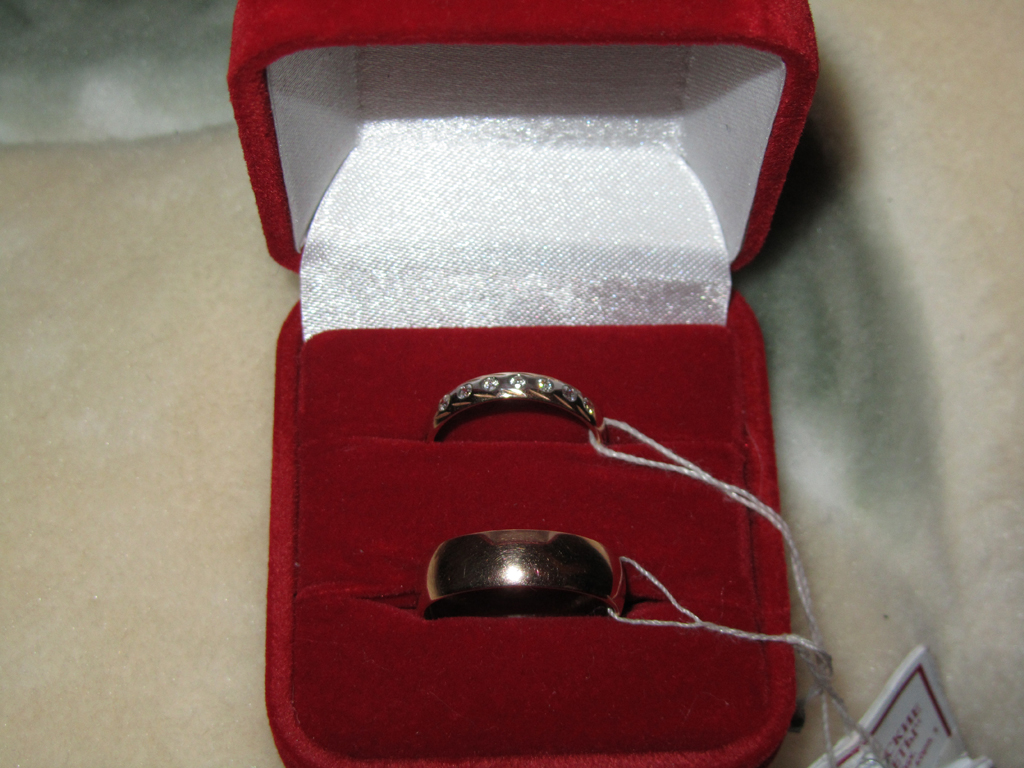 Обещанные фоточки колечек, не знаю насколько хорошо видно, но как смогла, так сфоткала.. Чтобы побольше была картинка, открывайте в новом окошке. Я довольна своим колечком, 7 бриллиантиков и они утоплены в колечко, не мешают вообще, не царапают и само колечко классическое, не болтиком, который мне совершенно не шел. Мое колечко еще и очень легенькое, а вот у Мишки 4,5 грамма.