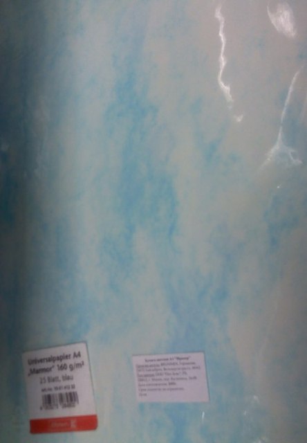 Лиса-Алиса, на обеде сегодня заскочила в ГУМ. там бумага есть, вдруг тебе куда пригодится. бумага вроде не плотная, т.е типа простой для печати. на упаковке написано мрамор, но очень НЕБО напоминает. Вложение: