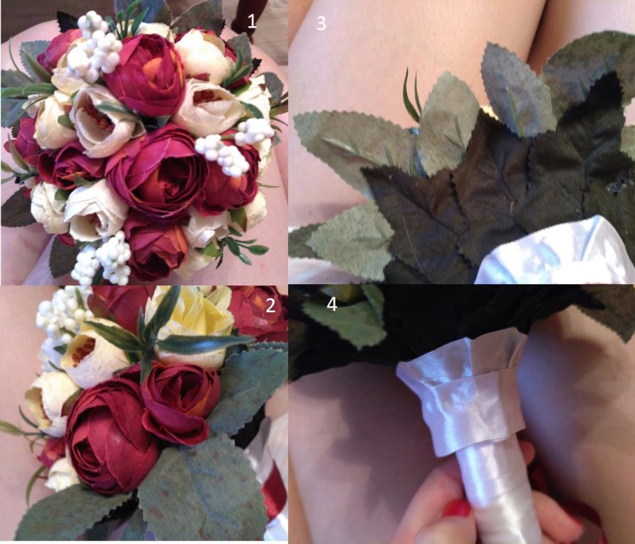 Фото 1. Обрезать мелкие детали из букета – тычинки, пластиковые листочки и тд. Растыкать между цветков, приклеить. Наклеить в два слоя на остальную часть микрофона, первый слой лицом к букету (фото 2), второй - лицом наружу (фото 3). Приклеивать очень крепко, лист на шаре, черенок на первой полоске ручки. Фото 4. Закрыть черенки листов широкой атласной лентой, укладывая в складки (я делала это двухсторонним скотчем), это сложновато и получается не очень аккуратно. Вложение: