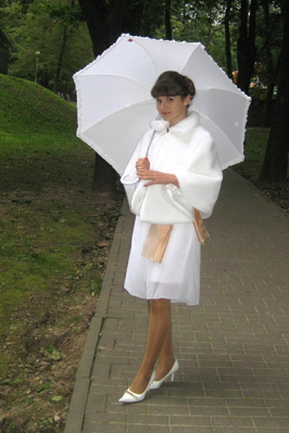 У меня было старое свадебное плать (не мое, я его купила недорого для каких-то других целей, но таки не использовала). Платье было беспощадно укорочено до колена, чтобы я могла нормальн ехать и не цеплять за педали и колеса. Правда в итоге всеравно прогодала, было чуть длинновато.