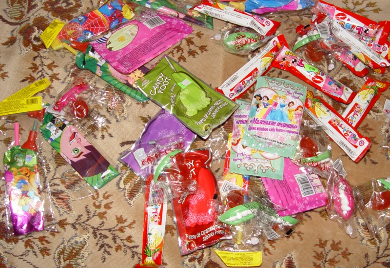 ..ааа.ещё.. купили подарочки детишкам.. т.к у нас их будет 6.. то мы девочкам купили леденцы-помады.. конфетки с накладными ногтями и бусами... а мальчишкам.. конфеты+надуваешь потом шар со спайдерменом.. , соски в виде конфеты.. а на обратной стороне губы с зубами)) Чтобы занять их хоть на часик... итого.. штук 30 конфет = 50.000 бел.руб.