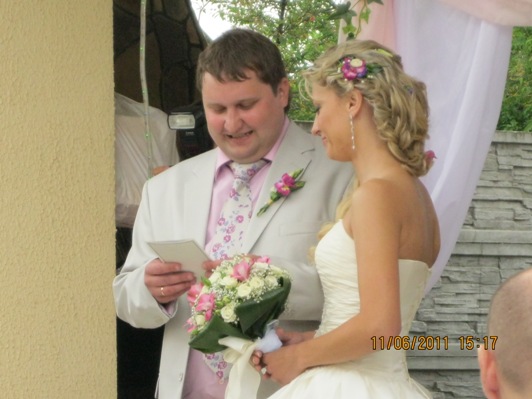 11 июня 2011г. для меня началось в 7.30 утра со звонка будильника.  Хоть меня и уверяли, что ночь будет бессонная. Наверное, сказались два предыдущих дня, когда вставала в 6 и до 11 вечера носилась по городу. В общем, в 8.30 я была у парикмахера и визажиста. И только там я смогла расслабиться в первый раз за всю неделю! Все что могли, уже сделали, поэтому оставалось только получать удовольствие. Девчата, конечно, молодцы! Юморили все утро, расказывали небылицы всяческие, веселили. Работа над моим образом немного затянулась (часа на полтора), поэтому домой я летела пулей. Там меня уже ждали жених и свидетели с друзьями. Все догрогу к дому они мучали меня распросами как и что делать и особенно "ты скоро будешь?". А когда я приехала, застала живописную картину: жених со свидетелем лежат на диване и смотрят телевизор! Вот это была картина! И это за 10 минут до выезда! Ровно 5 минут мне хватило, чтобы одеться. При этом забыла одеть сережки и браслет, которые свидетели уже утащили в машину. Наконец все были отправлены в коттедж, и мы с БМ спокойно сели в наш кабриолет. Под теплый летний ветерок, растрепавший мою прическу, мы двинулись к Оперному на фотосессию. Паша, конечно, молодец. Без особого напряга для нас он отснимал нас примерно 1,5 часа. А когда заморосил дождик, пошли в летнее кафе. Мама мне сообщила, что все уже собрались, свидетель с другом БМ выехал за тортом и регистратором. Вот только адрес перепутала я  . Сказать-то я сказала, что возле ДБ живет регистратор, а улицу перепутала! Сюжет развивался следующим образом: забрали они торт, БМ в паузе между фотками звонит свидетелю, спросить как дела. А он что-то жует и говорит, что торт забрали. Как вы думаете, что мог подумать мой БМ?  Правильно! А они мороженое топчут! В общем, едут они к ДБ мимо кафе, где мы фоткаемся, сигналят, мы машем им ручкой, уже почти уверены, что регистратора они заберут вовремя. Минут через 20 звоним уточнить забрали ли они ее, а в ответ: "почти". Как это "почти". Оказывается, сидят они возле ДБ, жуют свое мороженое в машине. Друг БМ говорит: "А чего мы сюда приехали, нам ведь на Комсомольскую надо". И разворачивает бумажку, на которой я своей же ручкой синим по белому написала неправильный адрес. Глотают они это самое мороженое и летят с Коммунистической на Комсомольскую. Приезжают, набирают регистратору, а она говорит: "А чего это вы там меня ждете, я на Коммунистической живу". Вот это поворот! В общем, забрали они ее, привезли в коттедж. Пока они опаздывали, мы еще и на Минск - Арену заехать успели. Ждем, пока нам позвонят и скажут, что все готово. Вроде и должны уже, а не звонят. Набираем свидетелю, а он говорит: "Не знаю, я штаны переодеваю". В общем, понятно. Он бедный даже туфли одеть забыл, в шлепках вышел. Заезжаем мы во дворик, и все! Смотрю - вокруг куча родственников, все нарядные, смеются, кричат. А меня ну просто паника охватила! На ватных ногах вылезаю из этого кабриолета. Идем по дорожке, вокруг столько незнакомых людей (родственники БМ, которых я в глаза не видела)! И все рассматривают, улыбаются. И я понимаю, что начинаю терять реальность. Регистратор просит включить вальс Мендельсона, из-за гостей появляется Крымов, и я понемногу начинаю успокаиваться. Регистратор начала читать бесконечные стихи, потом роспись, кольца, поцелуй и торжественное вручение свидетельства.