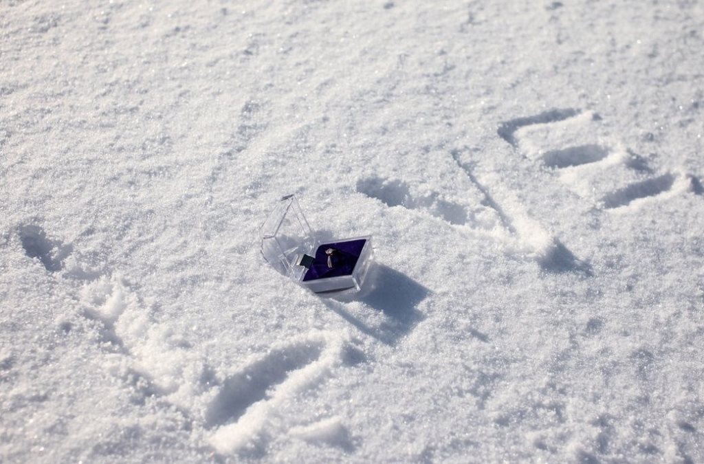 И вот, на годовщину отношений мы решили устроить фотосессию. Зима, светит солнце, мы в Лошицком парке, я отвернулась на пару секунд – и оп, на снегу коробочка с кольцом!!! Очень неожиданно и трогательно… Конечно я сказала да!