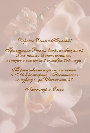 А скажи пожалуйста, а какой у тебя текст?мне не видно. я просто никак не могу придумать текст в пригласительные. Кстати, у нас с тобой свадьба вс разницей в 1 день.  )))