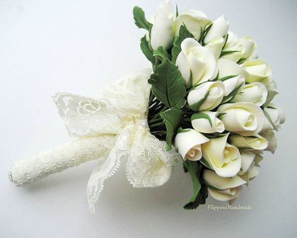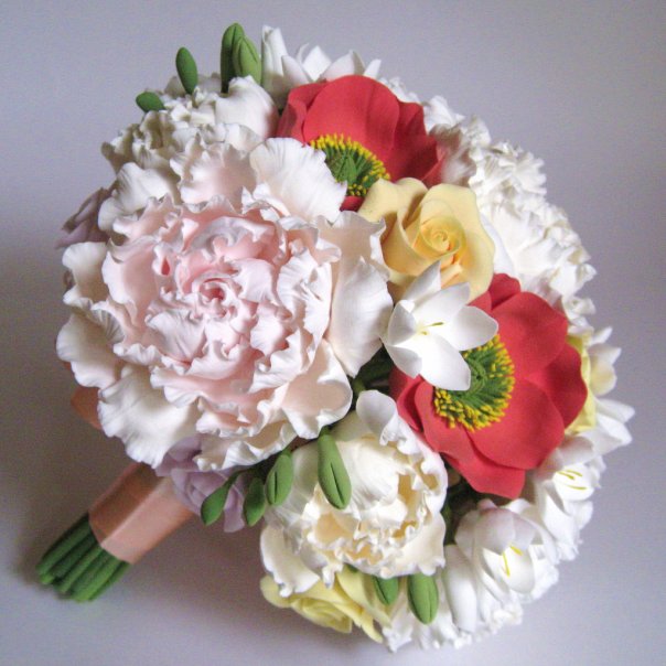 Что-то темка совсем заглохла. Т.к. я занимаюсь изготовлением букетов и украшений из полимерной глины, хочу показать вам, дорогие невесты, несколько букетов российских мастеров, чтоб вы имели представление о том, какую красоту можно сделать из полимерной глины. Такой букет внешне ничем не будет отличаться от живого, зато не завянет в течение дня, будет радовать Вас еще не один год и напоминать о таком замечательном дне вашей жизни:)