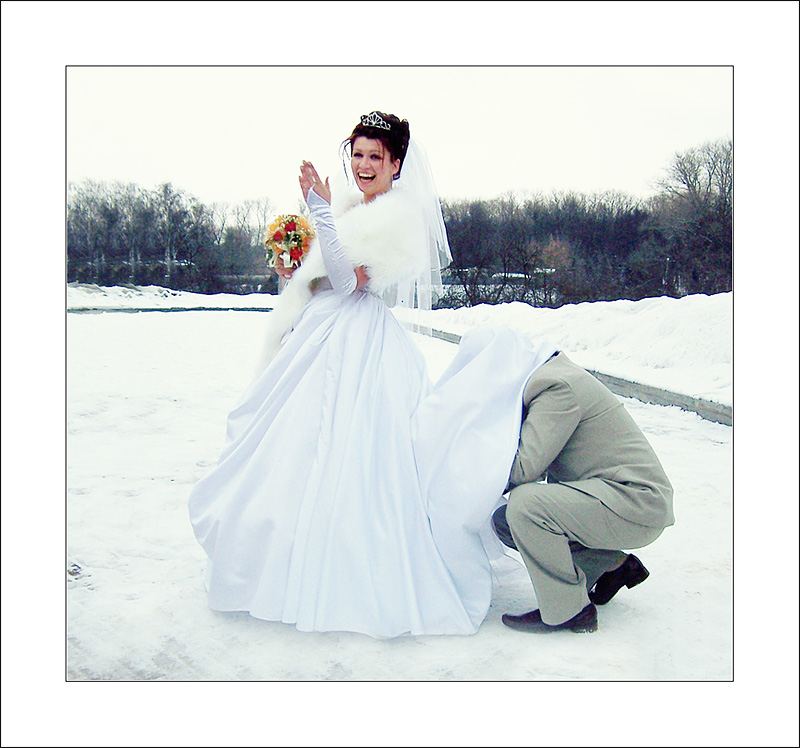 olikart писал(а): Заранее планировать хорошо, но обидно,если что-то не так(то погода,то люди...)А экспромт бывает удачным. Из личного:после росписи поехали фоткаться,но все получилось "серенько".(мокрый снег,гололед этому способствовали)  Зато во время банкета возле Дворца Республики,на катке,что-то получилось.Совершенно не знакомые люди поделились формой и советами  Путем некоторых манипуляций фото можно немного привести в порядок: Дорисовываем кусочек неба, добавляем снежка внизу, обрезаем ненужное справа, немного дорисовываем слева фон, оформляем в паспарту, ну и конечно корректируем по цвету, свету, контрасту + легкий фильтр... Результат налицо!