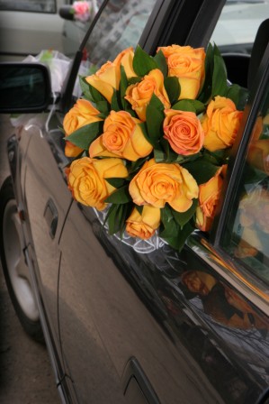 выбор букета был проблемой жениха. Он сказал, что выбрал из зеленых роз, но побоялся заказывать. Пошли вместе смотреть букеты. Мне очень понравился из ромашек, но нам сказали, что не сезон, ромашек нет. Выбрали вот такой. Кстати, фотограф потом сказала, что букетик мы отличный выбрали, так как он яркий и не сливался с платьем, добавлял изюминку.