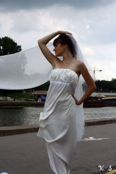 Платье шила в сумме дня да наверное, и те прямо наконуне. Ткань у меня лежала уже давно, купила ее просто так - потому что очень понравилась, и продавалась дешево почему-то. И ждала она своего звездного часа в шкафу) Фасон выбрала тоже давольно быстро - хотелось чего-то простого, очень нежного и романтичного. У нас почему-то платья стиля ампир чаще всего рассматривают как платья для беременных невест, и глубоку ошибаются. Если его правильно подобрать - очень хорошо подчеркивает фигуру, и даже стройнит. К тому же в нем гораздо удобнее, чем в карсете и кринолине)
