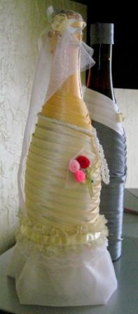 Подскажите, пожалуйста, как "нарядить" под жениха и невесту бутылки с шампанским. Фото посмотрела, а как сделать не совсем понимаю...