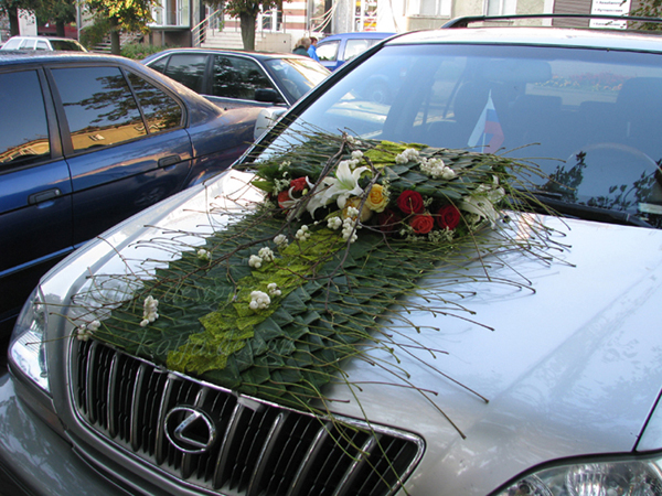 вот есть фото украшения на авто. Да из живых цветов смотриться красиво но дорого.